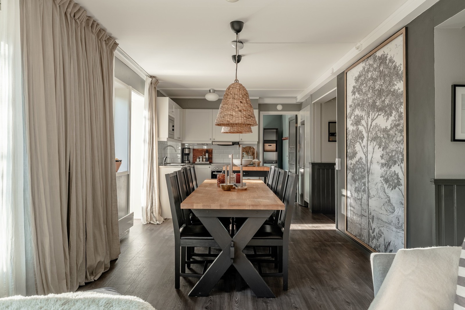 Öppen planlösning med plats för större hörnsoffa samt matplats för 10 personer.