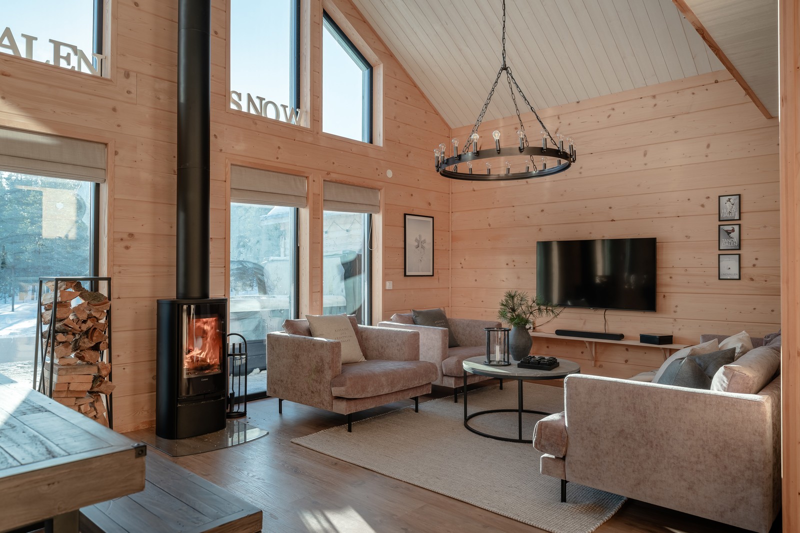 Husets hjärta är storstugan med ryggåstak, braskamin och stora fönsterpartier som bjuder på en öppen vy mot myren och Lindvallens pister. Ljuset från sydväst fyller rummet och förlänger känslan av rymd. Härifrån kliver ni rakt ut på den generösa altanen med både bastu och spabad – den självklara samlingsplatsen efter en aktiv dag på fjället.