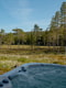 Stort trädäck som uteplats med soligt sydvästläge och fri utsikt mot Lindvallens pister, myren och Gubbmyrens längdskidspår. Plats för sittgrupp och spabad. Trädäcket löper runt huset och fram till entrén.