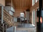 Öppet upp till nock. Trägolv, liggande timmerpanel på väggarna, gott om plats för en generös soffa, stora glasade fönster mot uteplatsen. Braskamin från Contura.