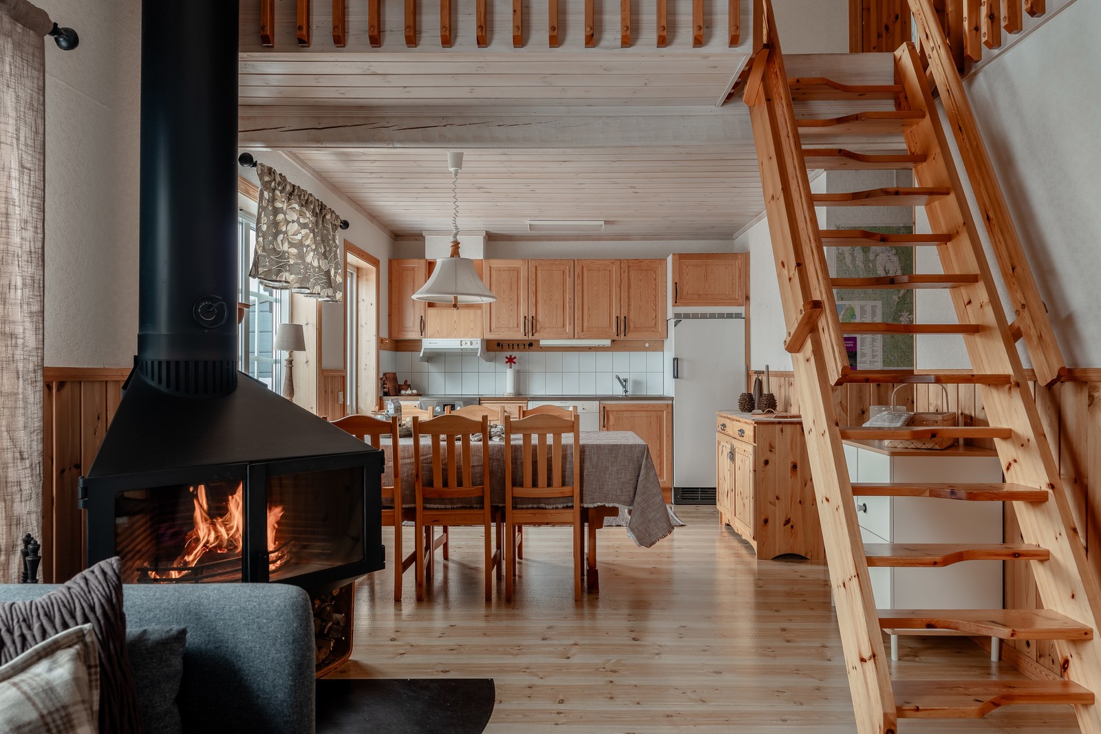 Interiört möts ni av träpanel i tak och bröstpanel på väggar som ger karaktär och fjällkänsla. Här finns utrymme att över tid sätta er egen prägel om så önskas.