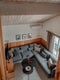 Bröstpanel med strukturtapet på väggar och plastmatta på golv. Träpanel i tak. Braskamin som bidrar med både värme och trivsel. Plats för soffa.