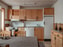 Bröstpanel samt tapet på väggar och plastmatta på golv. Träpanel i tak. Kakel vid diskbänk. Diskbänk i rostfritt stål och träluckor. Spis från Electrolux. Plats för matbord.