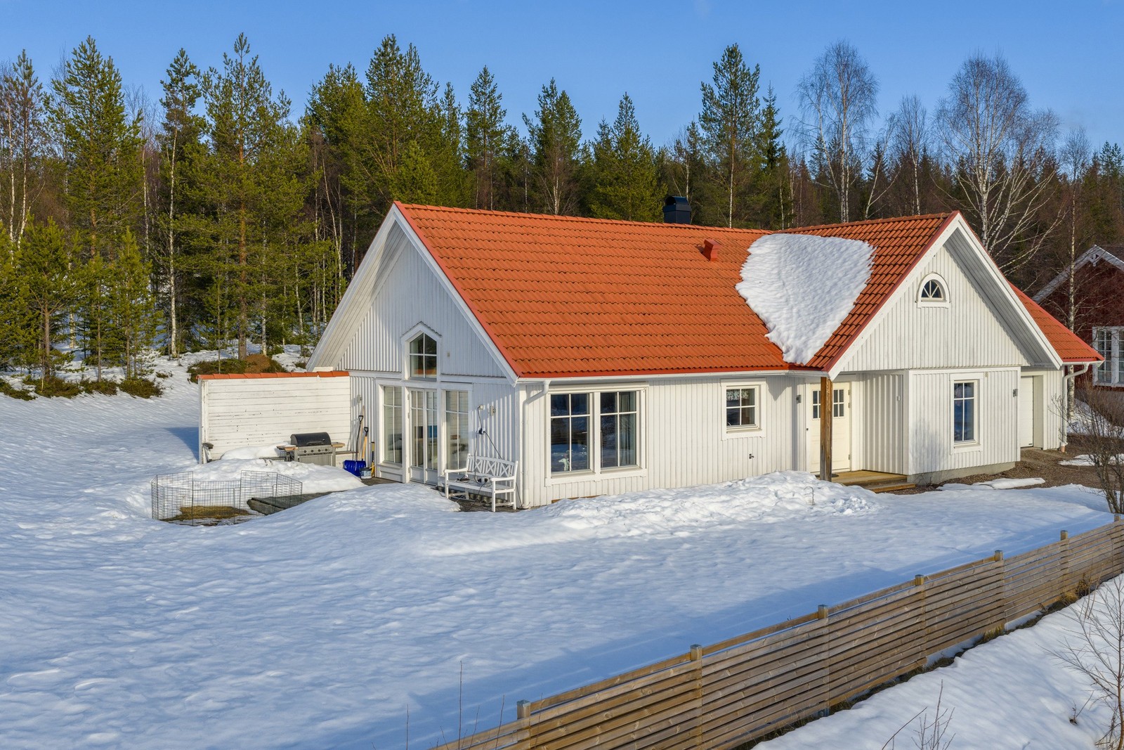 Huset är uppfört 2005 i ett plan, med en planlösning som passar familjelivet väl. Storstugan utgör hemmets självklara samlingspunkt där kök och vardagsrum möts i en öppen och social yta. Ryggåstaket förstärker rymden och ljuset, och braskaminen skapar en naturlig plats att samlas kring, oavsett om det är vardagskväll eller helg.