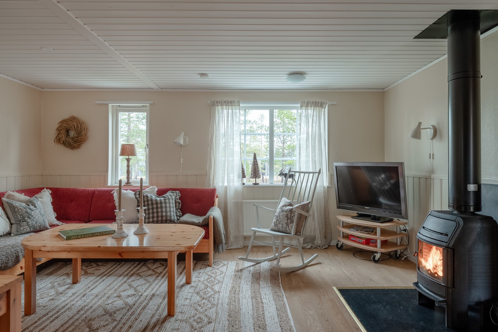 Trevlig storstuga med laminatgolv och en braskamin (Jötul) som ger extra trivsel. Här finns plats för både hörnsoffa och ett matbord för 6–8 personer. Väggarna har målad väv + bröstpanel, och i taket återfinns samma målade träpanel som i hallen.