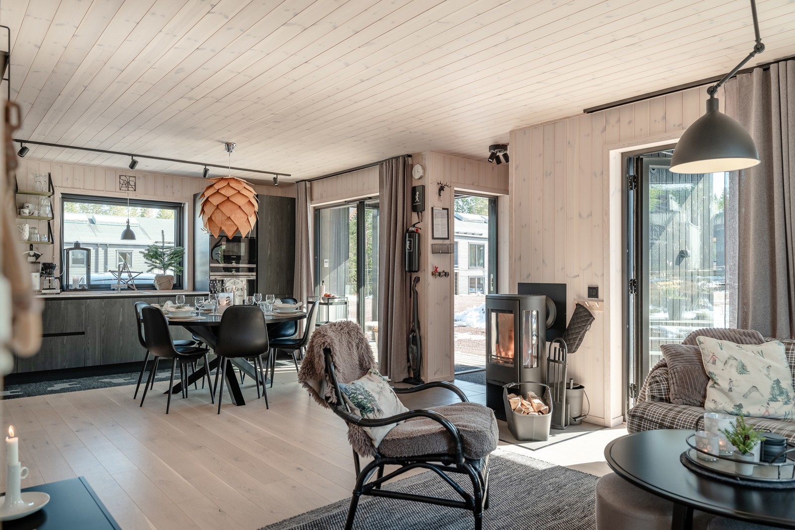 Bostaden har stora, härliga fönsterpartier som släpper in ljuset och förstärker kontakten med omgivningen. Den genomgående träpanelen på väggar och i tak tillsammans med parkettgolv skapar en varm och inbjudande fjällkänsla. Planlösningen är öppen och social där storstugan blir en naturlig samlingspunkt, en plats där ni gärna samlas efter dagens turer, lagar mat tillsammans och låter kvällen ta vid i lugn takt. Braskaminen tillför både värme och stämning och blir en självklar mittpunkt under årets kallare dagar.Köket är stilrent med enhetliga materialval och fullt utrustat för både vardag och lediga dagar. Här finns gott om plats för matbord där måltiderna får ta tid och samtalen fortsätta långt in på kvällen.