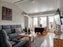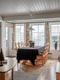 Parkettgolv, bröstpanel samt målad väv och vitt tak. Öppen planlösning med plats för generös soffgrupp och matbord för åtta personer.