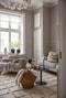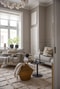 Stort och luftigt vardagsrum med vackra trägolv, generös takhöjd och fina stuckaturer som vittnar om bostadens sekelskifteskaraktär. Platsbyggd förvaring bidrar både till funktion och estetik. Två stora fönsterpartier med djupa fönsterbrädor ger rummet ett vackert ljusinsläpp och skapar en elegant inramning. Här finns gott om plats för soffgrupp, mediabänk och ytterligare möblemang efter behov.