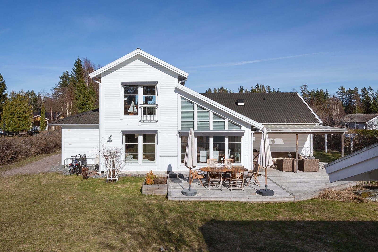 Stor altan i anslutning till huset med plats för matgrupp och loungemöbler. Delvis under tak. Balkong och fransk balkong i anslutning till övervåning.
