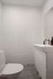 I anslutning till hallen finns gästtoalett som är inredd med kakel och klinker (med underliggande golvvärme – el), spegel samt handfat.