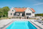 Mysig uteplats intill bostadshuset som ramas in med fin en stenmur. Från uteplatsen ned för några trappsteg når ni poolen på pooldäcket som sträcker sig ända fram till poolhuset.