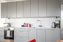 KÖK: Svensktillverkat kök med släta luckor i mellangrått och med stenskiva. Beslag i rostfritt och köksutrustning från Bosch i rostfritt med helintegrerad diskmaskin samt blandare från Tapwell.