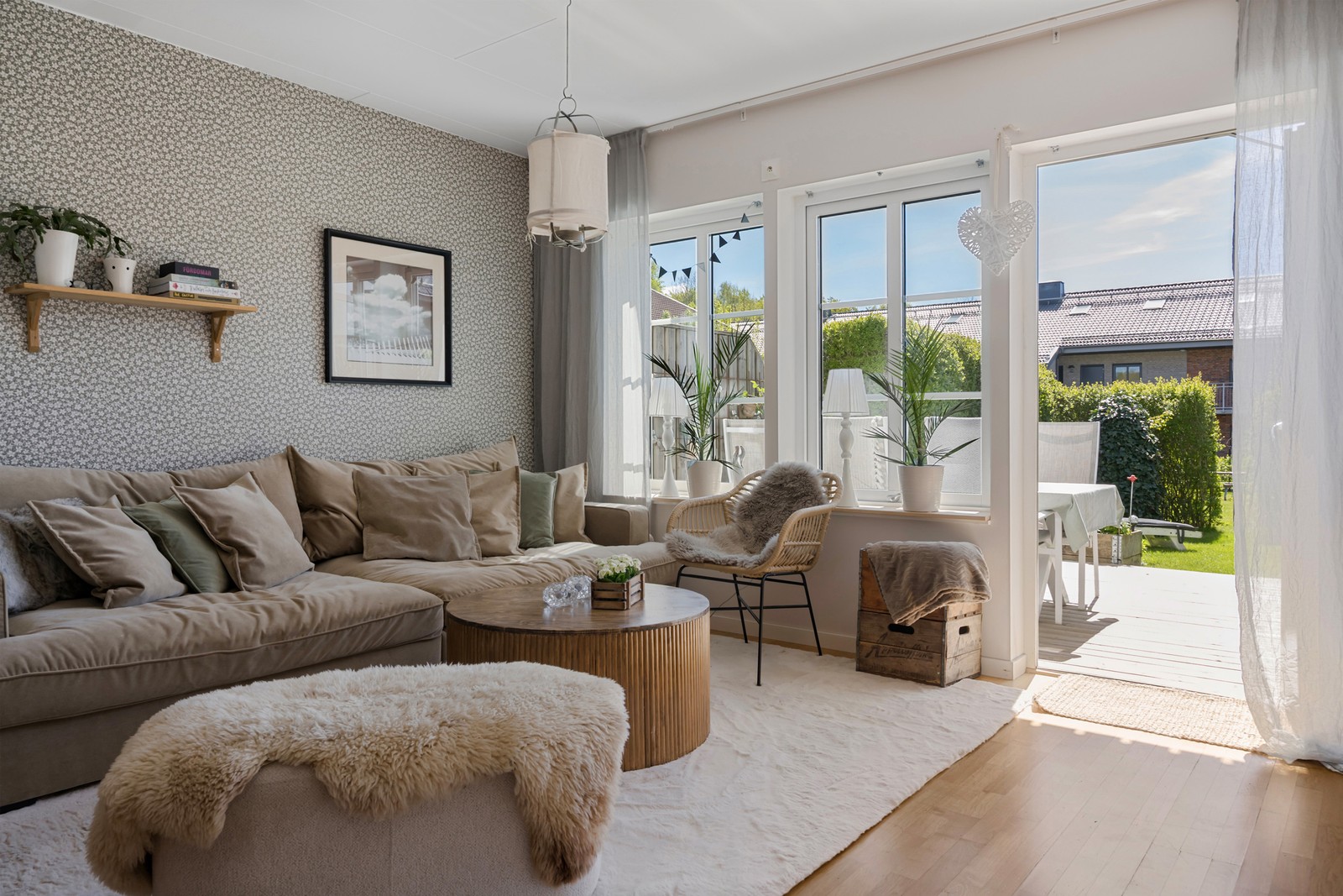Ljust och stilrent radhus med solig trädgård, balkong och praktisk planlösning i barnvänligt område.