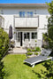 Den privata trädgården vetter i söderläge och ramas in av en tät, välvuxen buxbomshäck. Här finns ett trädäck för utemöbler, grill och odling – en riktig oas under årets varma månader.
