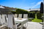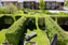 En grön oas med trädäck och gräsyta, omsluten av tät buxbomshäck. Perfekt för avkoppling, odling och utemiddagar.