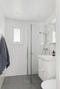 Här finns även ett eget badrum med dusch, WC och handfat – stilrent inrett med målat grått betonggolv och vita väggar.