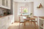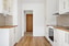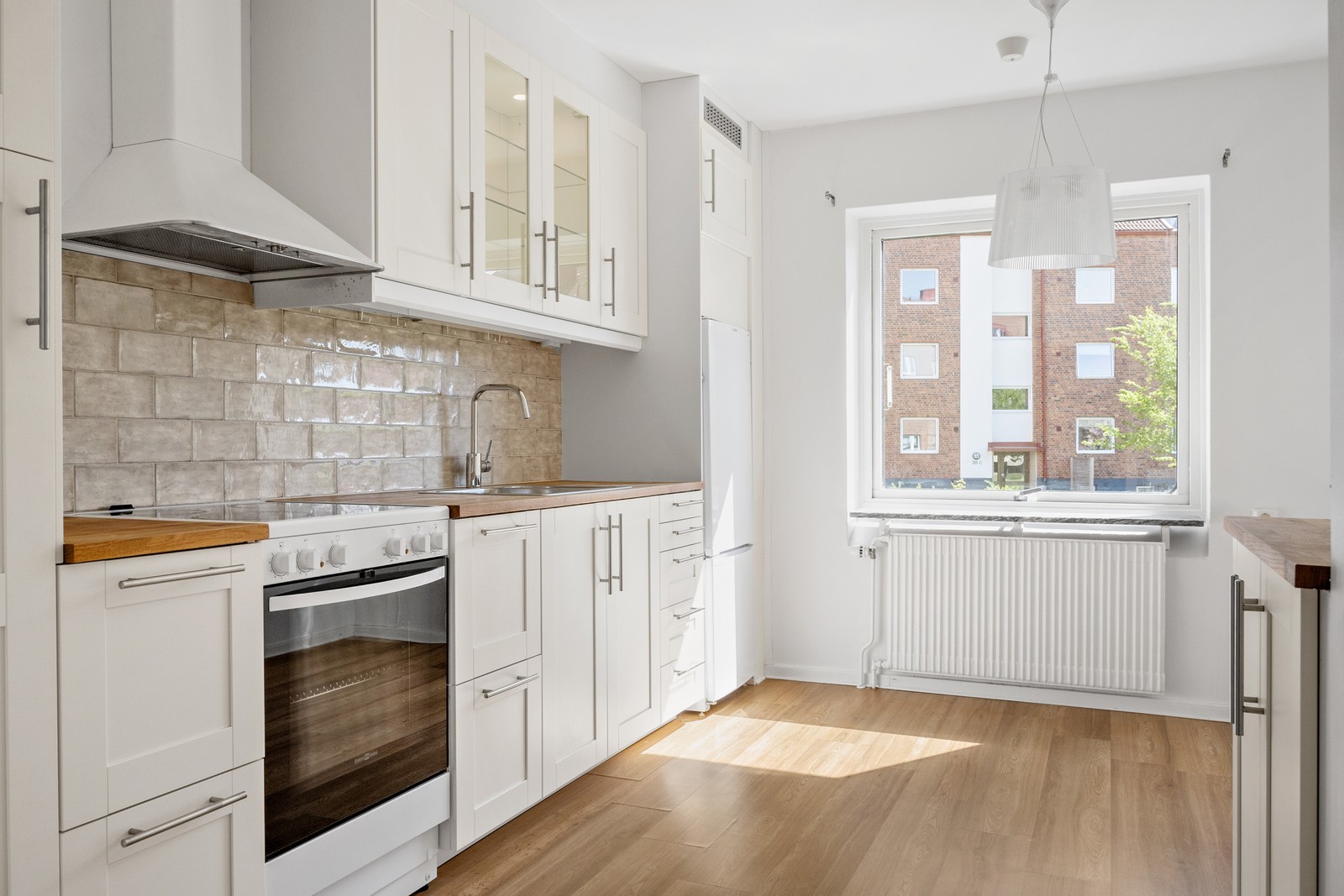 Ljust och inbjudande kök med klassiska vita skåpsluckor, träbänkskivor och kaklad vägg i varm beige ton. Här finns gott om förvaring samt utrustning i form av spis med ugn, fläkt, kyl/frys. Generöst fönsterparti ger ett härligt ljusinsläpp och rymmer plats för matbord intill. På golvet ligger ett stilrent laminatgolv som löper vidare ut mot hallen.
