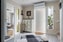 Stort och rofyllt sovrum med garderobsvägg och fönster mot trädgården.