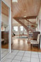 Nu överraskar villan med ett stort och strålande ljust kök där långväggen består av fyra nästan heltäckande glaspartier ut mot trädgården. En ljummen kväll står altandörren på vid gavel ut till grönska, fågelsång och ytterligare ett skyddat trädäck i byggnadens vinkel. Planlösningens och inredningens svaga diagonaler ger köket en mjuk och organisk atmosfär. Den ljusa klinkern och paneltaket kommer igen och tillsammans med de ljusa träfronterna med speglar ger det köket en blond och aningen rustik ton. Köket är fullt utrustat med integrerade vitvaror och inslag av rostfritt. Köket har gott om plats för köksbord intill de stora glaspartierna.