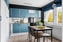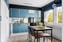 Köket är både stilfullt och funktionellt med gott om förvaring bakom blå köksluckor som kombineras fint med träbänkskivor och vitt kakel. Den maskinella utrustningen består av spis, ugn, kyl/frys och diskmaskin. Här finns även plats för matbord vid fönster som ger ett fint ljusinsläpp och skapar en trevlig matplats för både vardag och gäster.