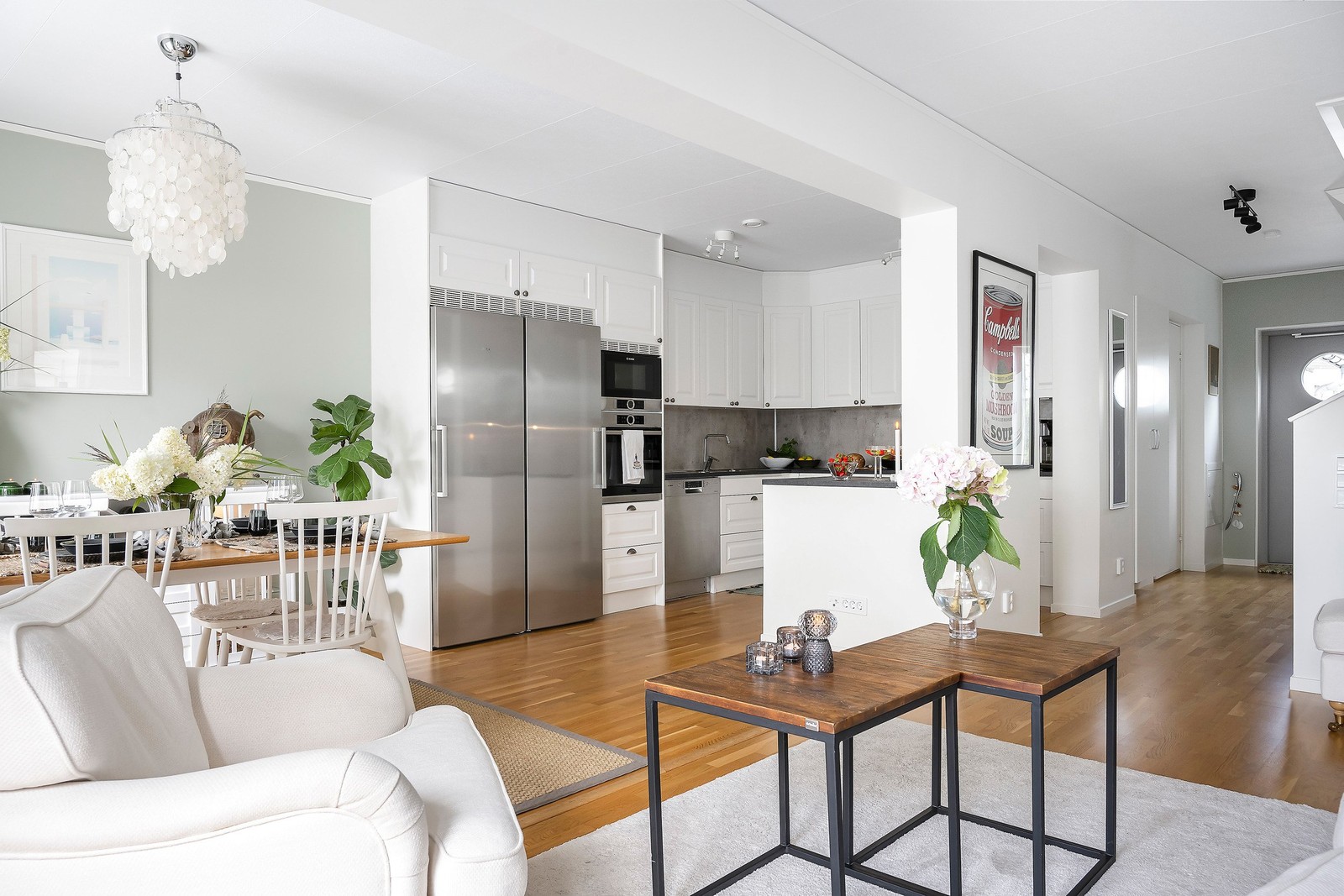 Välkomnande entré med plats för avhängning av ytterkläder och skor. Ljusa väggar och vackert parkettgolv som återkommer i hela bostaden.