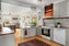 Köket är välutrustat med spis med häll, spisfläkt, diskmaskin och kyl medans frysen är smidigt placerad i skafferiet. Den öppna planlösningen mot matplatsen ger en social och inbjudande känsla, och plastmattan på golvet gör det praktiskt och lättskött. För barnens kreativa stunder finns även en egen köksö – ett kök för hela familjen att trivas i.