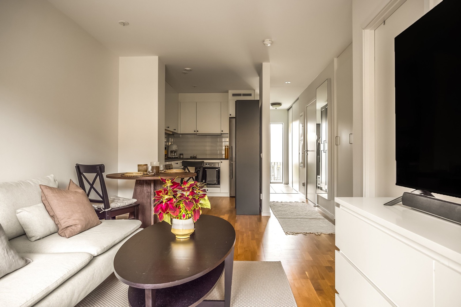 Den öppna planlösningen mellan kök och vardagsrum skapar en luftig känsla och låter ljuset flöda genom hela bostaden. Köket går i stilrent utförande med moderna vitvaror, gott om förvaring och väldisponerade arbetsytor. Vardagsrummet rymmer både soffgrupp och matbord, härifrån når du den soliga balkongen – perfekt för morgonkaffet eller en lugn kväll i kvällssolen.