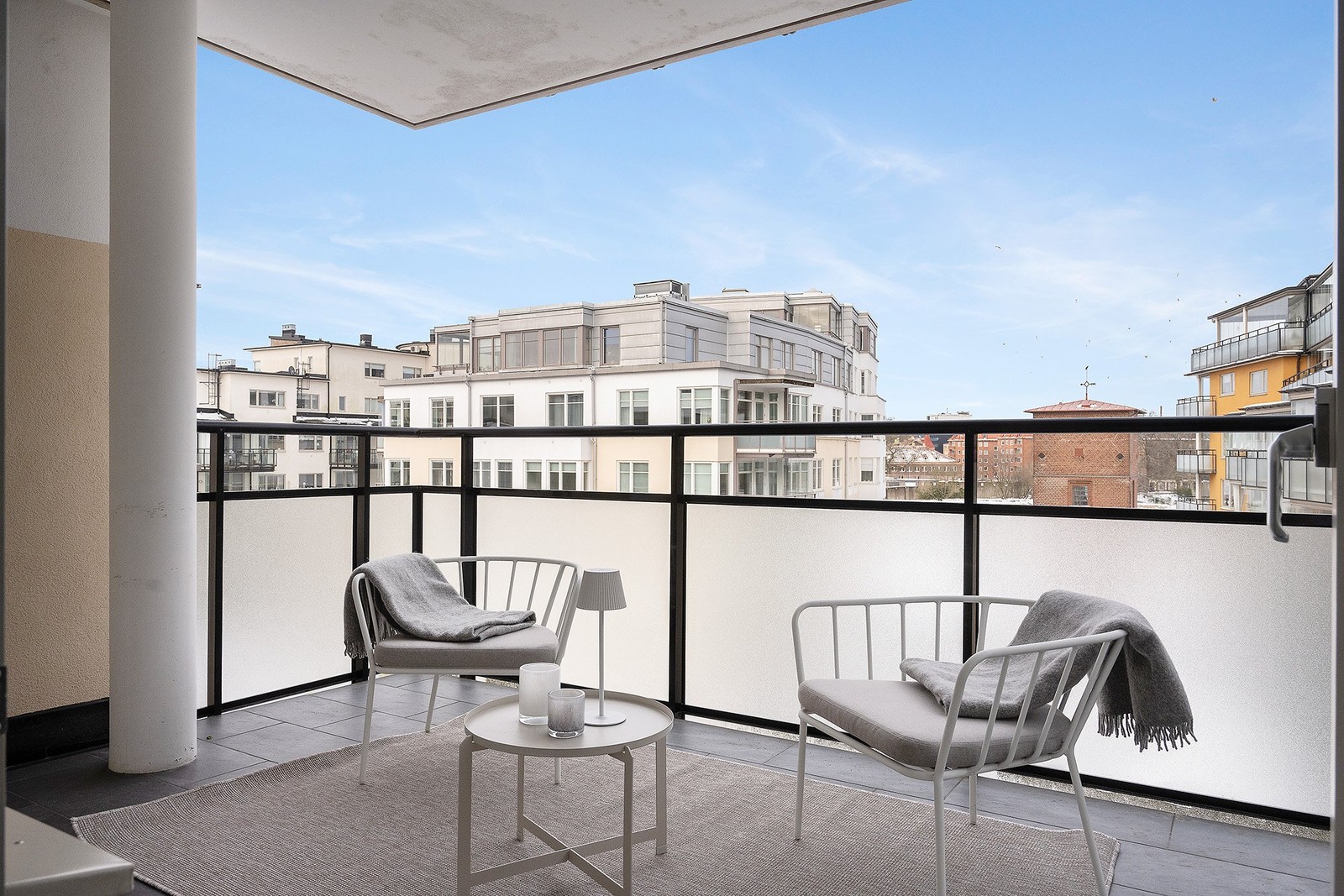 Balkongen är ett av bostadens absoluta guldkorn — stor, lättmöblerad och med ett fantastiskt västerläge (Nissan ligger i söder - norr) . Här finns gott om plats för loungemöbler och småbord. Utsikten sträcker sig över närområdets arkitektur och vidare bort mot Nissan, vilket ger en härlig känsla av rymd och närhet till vattnet. Den perfekta platsen för avkoppling, middagar eller morgonkaffet.
