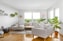 Vardagsrummet är ljust och luftigt med stora fönsterpartier och utgång till den privata uteplatsen. Här finns plats för både soffgrupp och läshörna, och den genomtänkta möbleringen tillsammans med inslag av gröna växter förstärker känslan av rymd och harmoni.