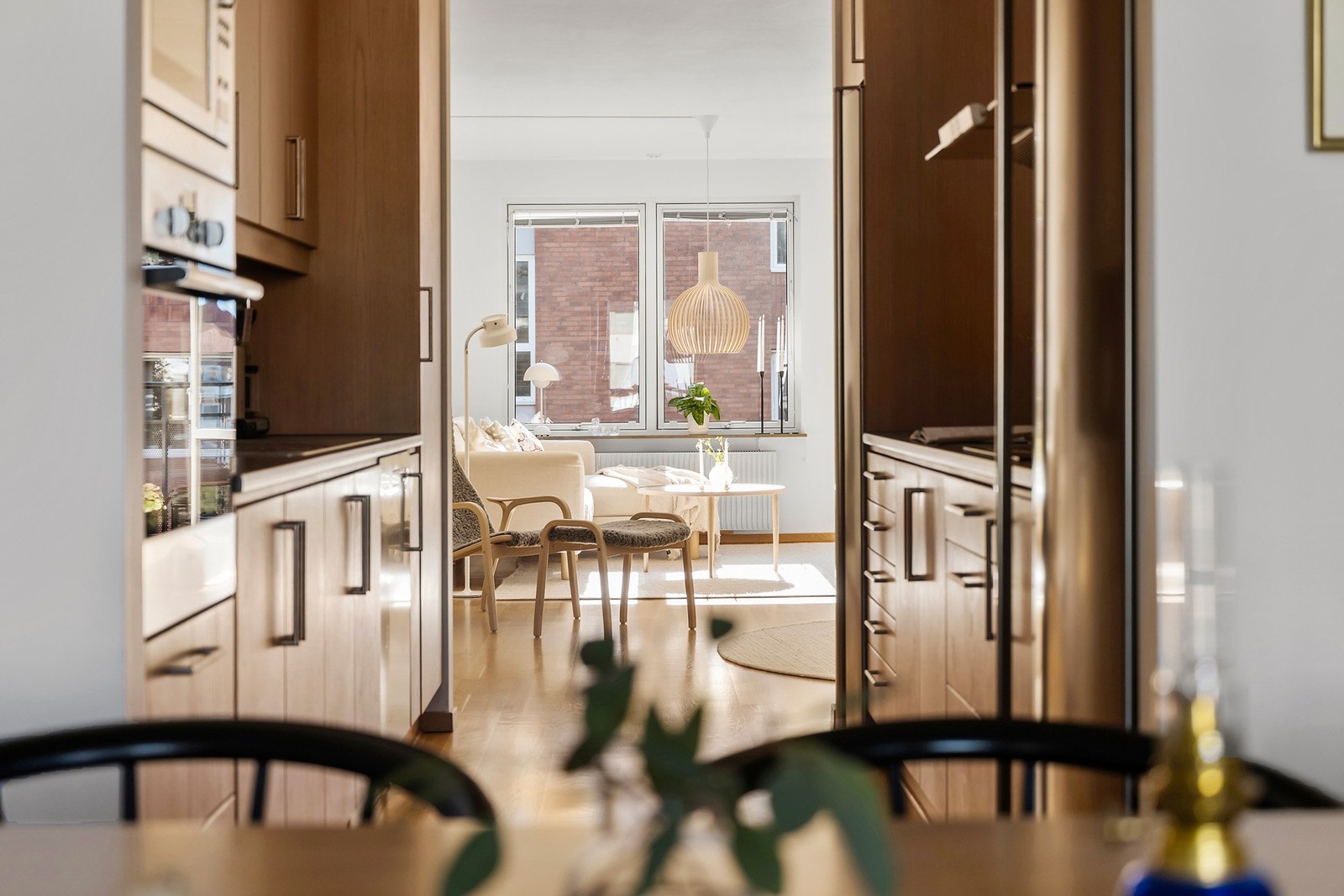 Planlösningen är social och genomtänkt med ett elegant kök i öppen anslutning till vardagsrummet – en naturlig samlingsplats för både vardagsliv och festliga tillställningar. Vidare finns ett helkaklat badrum med egna tvättmöjligheter samt två rofyllda sovrum med plats för både förvaring och vila.