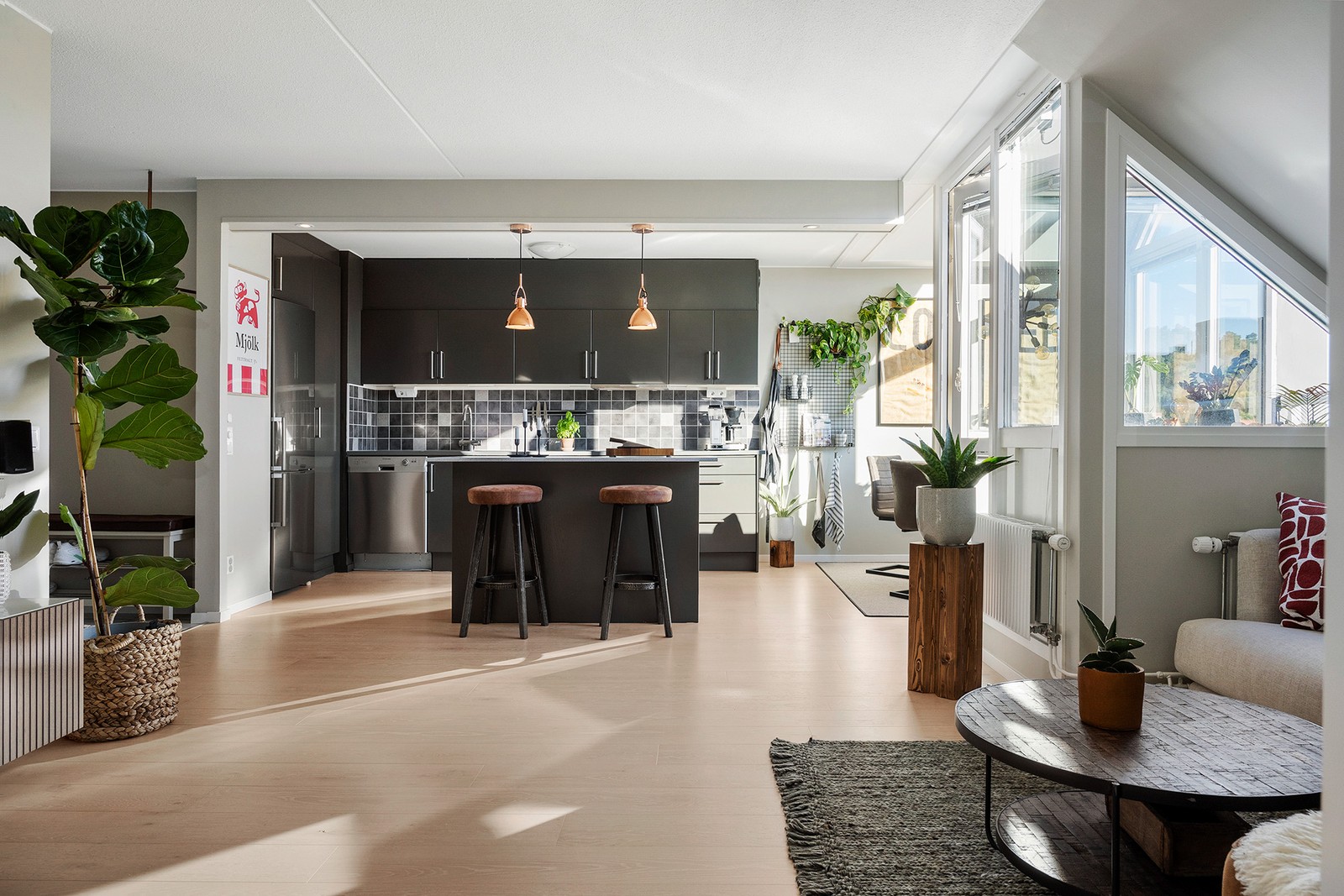 Bostadens hjärta är den öppna planlösningen där kök, matplats och vardagsrum flyter samman i en social och inbjudande yta. Köket är smakfullt inrett i en modern grå nyans som både tillför karaktär och elegans. Här finns en generös köksö som bjuder in till både matlagning, mingel och härliga middagsförberedelser. Matplatsen vid de stora fönsterpartierna blir en självklar samlingspunkt för såväl vardagsmåltider som festliga tillställningar. Den fulla maskinella utrustningen med spishäll, fläkt, diskmaskin, kyl/frys och vinkyl gör köket komplett. Från vardagsrummet öppnar altandörrarna upp till en solig balkong som förlänger sällskapsytan under årets varmare månader.