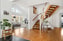 Vardagsrummet imponerar med generös takhöjd, stora fönsterpartier i flera väderstreck och vackra överljus som fyller rummet med dagsljus. Den vitputsade öppna spisen blir en naturlig mittpunkt som skapar både karaktär och stämning. Här finns gott om plats för större möblemang och rummet fungerar lika väl för lugna hemmakvällar som för sociala tillställningar.