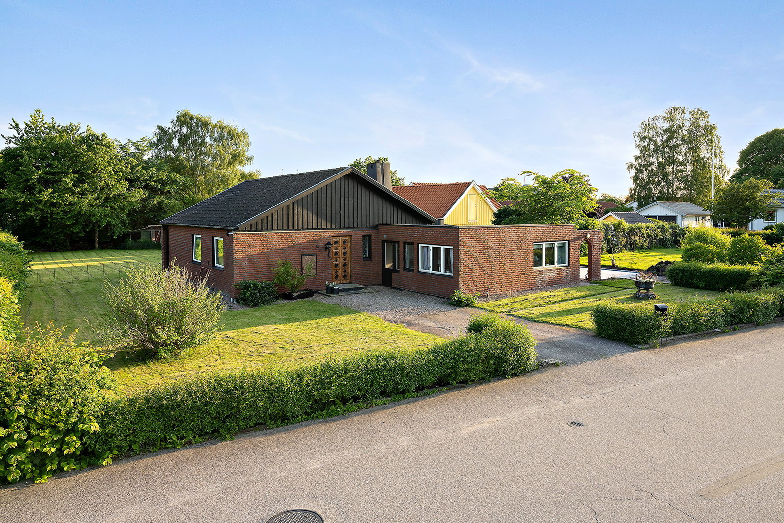 Trädgården är verkligen ett av fastighetens stora trumfkort – stor, lättskött och insynsskyddad med plats för lek, spel och avkoppling. Här kan barnen springa fritt medan de vuxna njuter av lugnet och kanske av en kopp kaffe i solen.