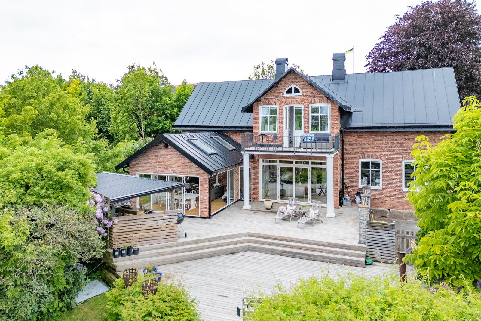 Den ståtliga tegelfasaden ramas in av vackra spröjsade fönster, pampiga pelare och en generös terrass i flera nivåer som bjuder in till långa sommardagar i solen. Här finns gott om plats för både vila och fest – från frukost i morgonsolen till kvällsgrillning i det välutrustade uteköket under tak, komplett med gasolgrill och serveringsytor i rustik stil.