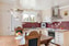 Vardagsrummet är ljust med fönster i tre väderstreck och har ett fint stavparkett på golvet samt en silverrandig tapet på väggarna. Här ryms både soffgruppen och matsalsgruppen.