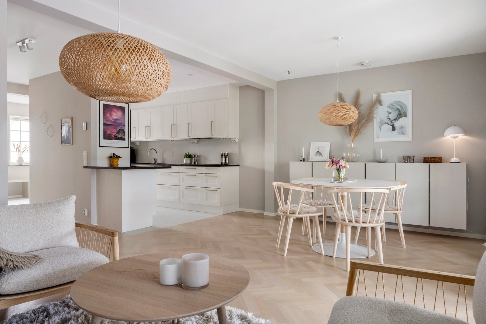 Vardagsrummet är hjärtat i hemmet – ett generöst sällskapsrum med vackert ljusinsläpp och stilren inredning. Golvet är klätt med vitlaserad fiskbensparkett, vilket ger rummet en exklusiv och tidlös karaktär.