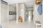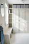 Redan i hallen möts du av en harmonisk färgpalett och genomtänkt förvaring. Platsbyggda garderober med stilrena luckor och öppna hyllor ger både funktion och estetik, medan sittbänken vid fönstret skapar en välkomnande känsla. Golvet pryds av fint klinker som både är praktiskt och elegant.