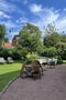 Uppväxt och vacker trädgårdstomt som kantas av stensättningar, bärbuskar och frukträd.