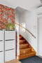Redan i hallen får huset en varm och välkomnande entré. Den uttrycksfulla tapeten möter de ljusa väggarna och skapar en härlig kontrast, samtidigt som fönstret vid trappan släpper in fint dagsljus. Här finns gott om plats för avhängning och smart förvaring, och rummet öppnar sig naturligt mot hemmets sociala delar.
