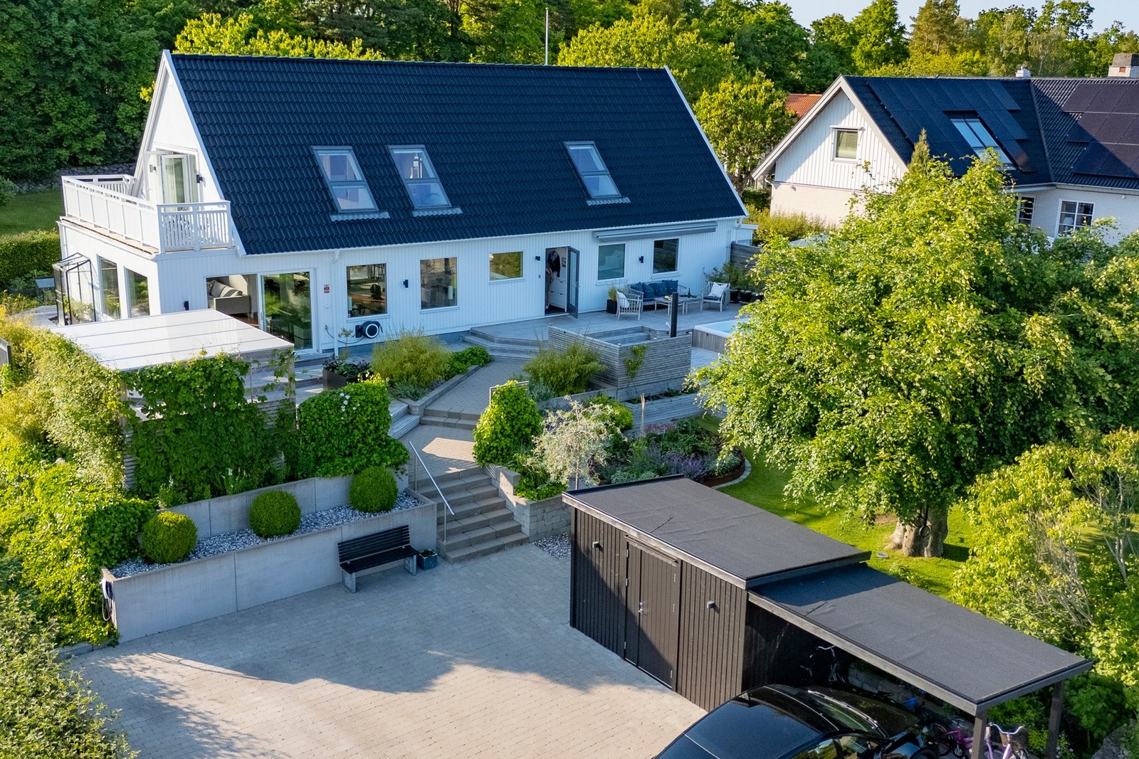 Modernt drömboende i högt läge med havsutsikt, 5 sovrum, 2 badrum och generösa umgängesytor.