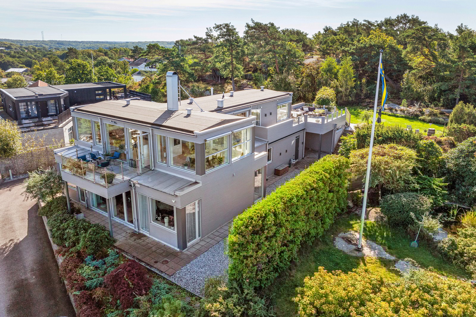 En av villans absoluta huvudnummer är de stora terrassytorna som omfamnar stora delar av villans söder, norr- och västerfasad och fångar solljuset hela dagen. Från köket kan man gå ut på västerbalkongen som leder fram till en stor altanyta i soligt söderläge med glasräcken. Här finns plats för både lounge och långbord. Trappor leder ner till trädgårdens övre grönytor och en helt privat och skyddad stenterrass omfamnad av klippor och grönska. Trädgården vetter mot grönområde så det blir ett mycket insynsskyddat läge. Ytterligare ett etage ner, i höjd med entréplanet, ligger den japanskinspirerade trädgården med grönska, singel och stenpartier i skydd av en hög thujahäck.