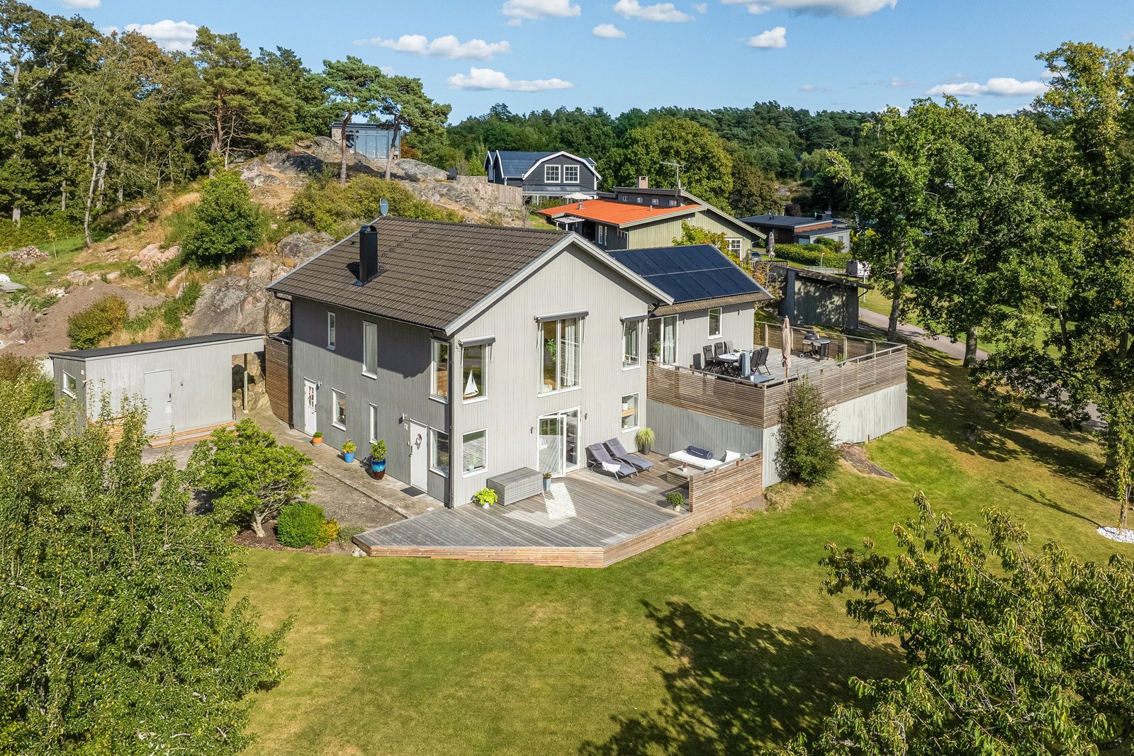 Utomhus erbjuds två stora altaner i soligt västerläge där ni kan njuta av långa sommarkvällar i en grönskande och privat miljö. Altanen på övre plan går runt tre av husets sidor och mäter hela 155 m2, och den nedre altanen är 50 m2 stor.