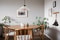 Ett ljust och rymligt vardagsrum som enkelt möbleras med stor sittgrupp, mediamöbel och matbord för traditionella middagar tillsammans med vänner.