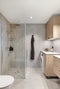 Utanför sovrummet fortsätter akustikpanelen som en detalj på väggen mot köksön. Badrummet är placerat mellan sovrum och sällskapsrum. Här återfinns de stora klinkerplattorna som ge ren modern och stilren känsla. Härlig golvvärme värmer gott. Badrumsinredningen från Ballingslöv går i ljus träton som mjukar upp känslan. Badrummet är utrustat med kombinerad tvättmaskin och torktumlare, arbetsbänk, under- och överskåp, dusch, handdukstork, kommod med förvaring samt spegelskåp.
