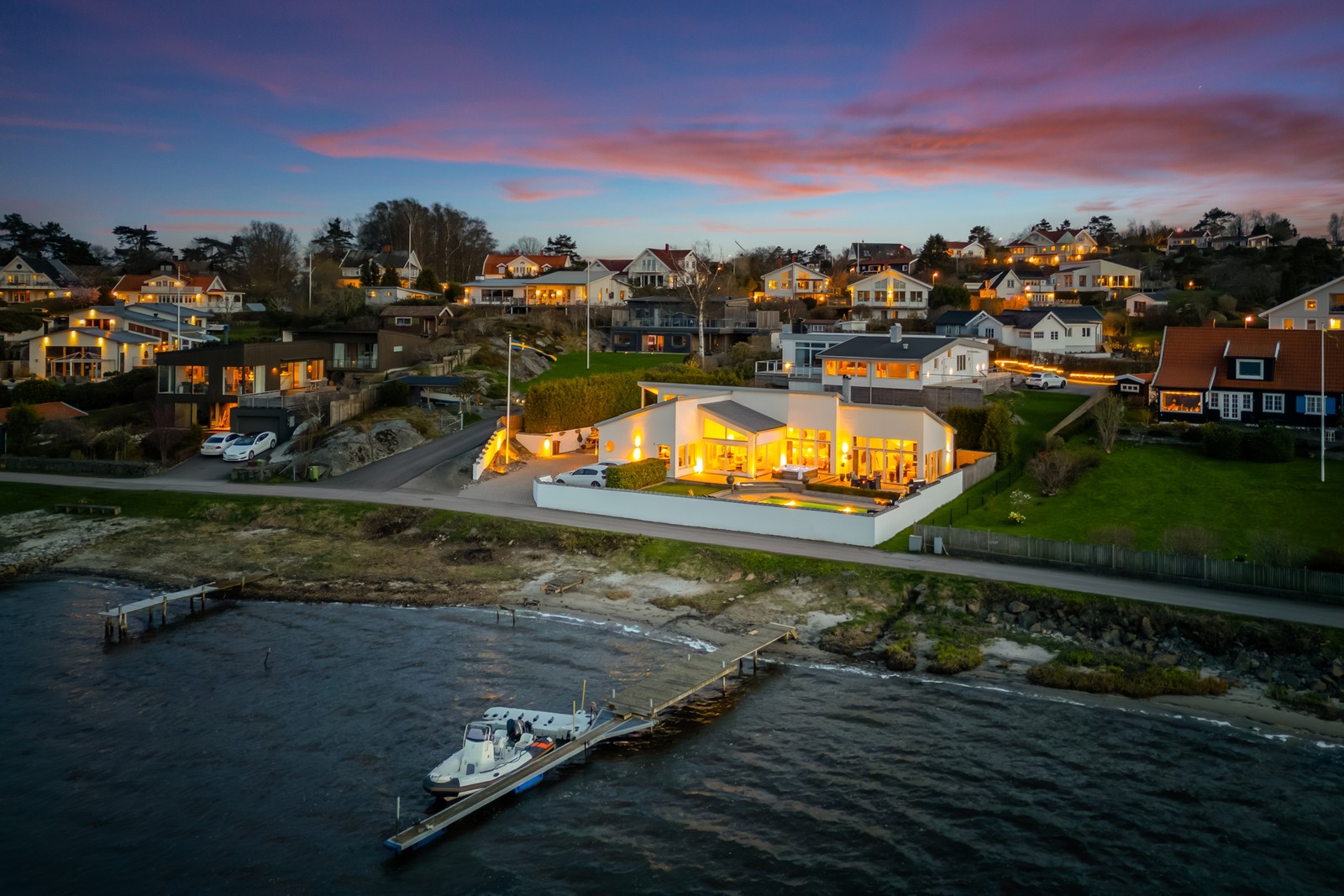 Strandvilla med fritt havspanorama, 5 meter i tak och stort poolområde – 15 m från vågor och brygga