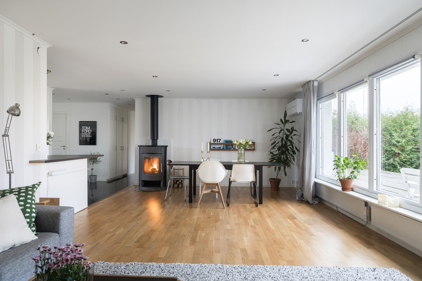 Ni välkomnas av en rymlig hall med ett smakfullt klinkergolv och gott om förvaringsmöjligheter samt en praktisk klädkammare. Vidare öppnar bostaden upp för en trevlig och social planlösning mellan det moderna köket och sällskapsrummet som blir hemmets självklara samlingspunkt. Mellan hall, kök och sovrum löper ett enhetligt klinkergolv och vidare möter ett vackert parkettgolv de ljusa väggarna i bostadens tre sovrum och rymliga matsal/ sällskapsrum. Ljuset flödar in genom sällskapsrummets stora fönsterpartier och skapar en härlig känsla av rymd och harmoni från den grönskande trädgården. Härifrån kan ni öppna upp altandörren och låta trädgården bli en del av bostaden vilket ger ytterligare rum till de sociala ytorna när vänner och familj samlas för såväl vardagsmiddagar som högtider. Ni kan njuta av braskaminens rogivande sken från flera håll i hemmet, då den är centralt placerad i bostaden och ger både värme och mysiga stunder. Enplansvillan har tre rymliga sovrum samlat i den mer privata delen av bostaden. Master bedroom erbjuder gott om förvaring i form av en platsbyggd garderobsvägg och från detta sovrum har ni direkt anslutning till altanen – perfekt för morgonkaffet eller en plats att avsluta dagen på i kvällssolen. Bostadens ytterligare två sovrum har plats för både säng, skrivbord och kontorsdel, det ena med utsikt mot trädgården och det andra mot framsidans morgonsol.