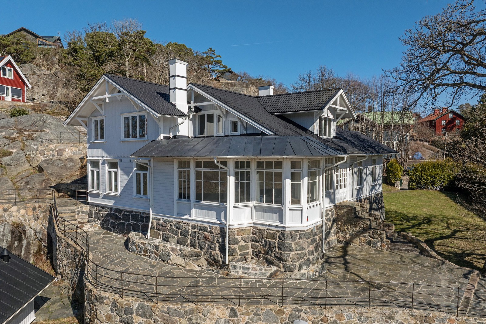 Villan Fjellbos höga husgrund är i vackert murad granit och fasaden har stående träpanel med snickarglädje under det svarta taket med utsprång och kupor. Arkitekturen är tidstypiskt för det sena 1800-talet med drag av den då populära Schweizerstilens lekfulla snickerier. Ovanför uteplatsen i skiffer sträcker sig de närmast heltäckande och spröjsade glaspartierna runt villans hörn och den U-formade glasverandan. Där innanför öppnar sig de stora sällskapsytorna där kvällssolen faller vackert över slipade, vitlaserade trägolv. Det stora rummet är som en gigantisk punschveranda och periodens detaljer radar upp sig med detaljskurna listverk, långa fönsterbrädor, överfönster, smäcker öppen spis och synliga takbjälkar i det höga och vita paneltaket. I fil ligger en ansenlig matsal med samma blonda trägolv, bröstpanel och ljus från två håll. En vit duk och några levande ljus räcker för att återskapa atmosfären när Göteborgs societet, samt en och annan kunglighet, dinerade härinne. I öppen planlösning ligger det ljusa och stiltroget nyskapade köket med barhäng, helintegrerade vitvaror och kallskafferi. På detta plan finns bland annat även ett femstjärnigt badrum och en lång inre hall. En stiltrogen trätrappa leder upp till övervåningen med sällskapsytor, sobert badrum och upp till fem rymliga sovrum. Även här är interiören stiltrogen med trägolv, detaljskurna listverk, breda fönsterpartier, klädkammare, öppen spis, kakelugn och spegeldörrar. Ett av hörnrummen, med utsikt mot vårdträdets grönska, sägs varit kung Gustav V:s favoritrum när han flera gånger övernattade här. Utöver alla dessa sovrum har villan två separata och kompletta gästlägenheter med allrum, pentry, badrum och sovrum. Den ena ligger på entréplanet med egen entré och den andra ligger över garaget. Lägenheterna öppnar även för generationsboende eller eget företagande. Villan ligger på en privat hörntomt omfamnad av klippor och lummig grönska. Den stora trädgården är skyddad med omfattande gräsytor samt flera uteplatser i olika etage med höga utsiktsplatser över de pastorala omgivningarna. Även tomtbiten Särö 1:410 på ca 80 kvm som idag används som en parkeringsplats ingår i köpet. Villa Fjellbo har en rik historia och byggdes av grosshandlaren och redaren August Carlsson. Huset övertogs av familjen Fjellbo och senare av den uppburna släkten Keiller som bland annat grundade Götaverken. De ägde villan från 1903 till 1957. Det fria läget på södra Särö är svårslaget med några minuter till morgondoppet i Särö Västerskog eller Bassängbacken och det är även given närhet till skärgårdsatmosfären och båtlivet. Möjlighet att köpa båtplats finns vid Bassängbacken. Till centrala Göteborg tar det en halvtimme med bil.