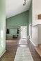 Entrén möter er med en väl tilltagen hall som likväl kan delas av och skapa ett kontor eller mindre sovrum. I hallen slås man direkt av den fantastiska takhöjden som ger luft till rummet. Väggarna går i en behagliga skogsgröna nyanser. Här finns plats att sätta in garderobsinredning för förvaring av ytterkläder. Till höger om hallen är tvättstugan placerad. Det mörka golvet bryts av med krispigt vita väggar. Här finns tvättmaskin och torktumlare samt en tvättho. Master bedroom har en ljusblå färg på väggarna och ljust golv. Genom fönster i två väderstreck flödar ljuset in i rummet. Master bedroom ger plats för en större dubbelsäng och förvaringsmöbler. Praktiska garderober finns placerade direkt till höger från dörren.