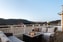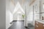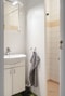 Badrummet på övervåningen är modernt inrett med mörkt klinkergolv som värms upp av vattenburen golvvärme. Delvis vitmålade väggar tillsammans med delvis kaklade väggar i vitt ger en fin kontrast mot golvet. Rustika träbalkar i taket skapar en spännande karaktär. Badrummet är utrustat med dusch, badkar, kommod, toalett och en större arbetsbänk över tvättmaskinen. En egen balkong nås via dörren vid badkaret och låter ljuset flöda in i rummet.