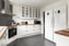 Köket med vita spröjsade skåpsluckor med glas ger en lantlig karaktär. Bänkskivan i trä skapar en stor arbetsyta och mjukar upp intrycket. Ovanför spishällen är väggen kaklad i svart som bryter av fint mot de i övrigt vita väggarna. Köket är utrustat med ugn, spishäll, köksfläkt, integrerad diskmaskin, kyl och frys.